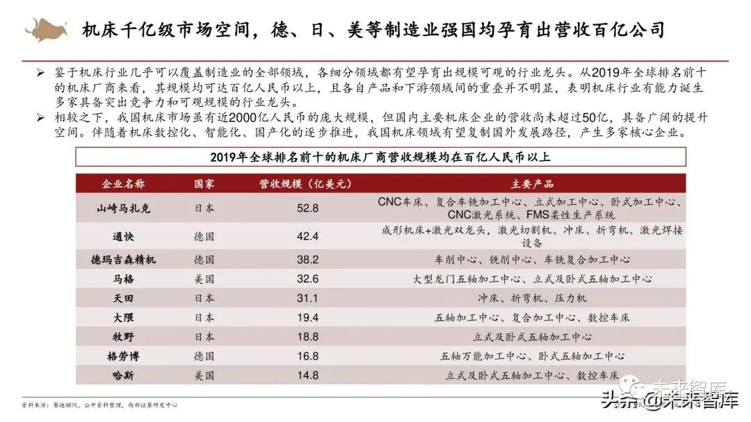 鉴于机床行业几乎可以覆盖制造业的全部领域,各细分领域都有望孕育出规模可观的行业龙头。从2019年全球排名前十 的机床厂商来看,其规模均可达百亿人民币以上,且各自产品和下游领域间的重叠并不明显,表明机床行业有能力诞生 多家具备突出竞争力和可观规模的行业龙头。相较之下,我国机床市场虽有近2000亿人民币的庞大规模,但国内主要机床企业的营收尚未超过50亿,具备广阔的提升 空间。伴随着机床数控化、智能化、国产化的逐步推进,我国机床领域有望复制国外发展路径,产生多家核心企业。